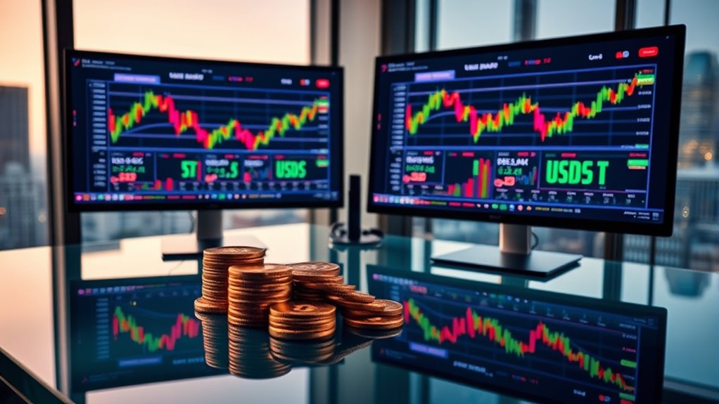 Stablecoins like USDT and USDC have become essential in crypto trading because they offer stability, liquidity, and fast transfers across markets. USDT dominates with over half the market, mainly on exchanges, while USDC is gaining trust for its transparency and regulation. These coins help traders hedge against volatility and move funds efficiently worldwide. As this ecosystem evolves, you’ll uncover how regulations, transparency, and market dynamics shape their critical role.