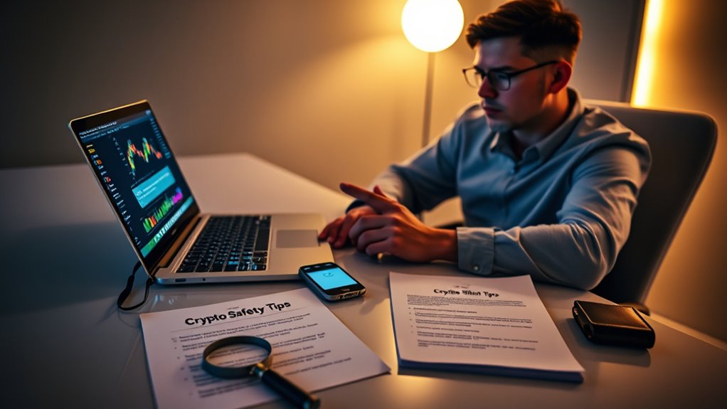 To avoid crypto scams and rug pulls, stay vigilant by verifying platform credentials, researching project teams, and avoiding promises of guaranteed high returns. Be cautious of fake websites, phishing emails, and suspicious links. Use strong passwords, enable two-factor authentication, and store your assets in secure wallets. Recognize red flags like vague details or lack of regulation. If you want to uncover more safety tips, this guide has everything you need to protect your investments.