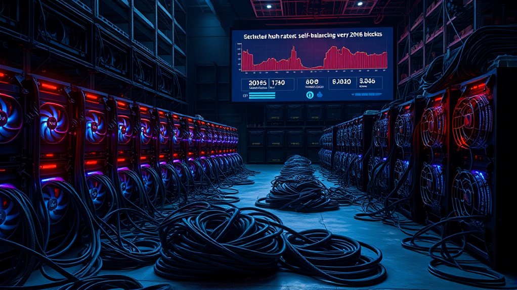 As you watch the network shift and sway like a busy river, mining difficulty adjusts every 2,016 blocks to keep the flow steady. Picture miners as paddle-wielding boaters, steering through changing currents, ensuring the stream of new blocks remains smooth. This self-balancing dance keeps the blockchain steady and secure, no matter how many boats join or leave the river. It’s a relentless, dynamic rhythm that keeps the entire system humming along seamlessly, no matter what comes downstream.