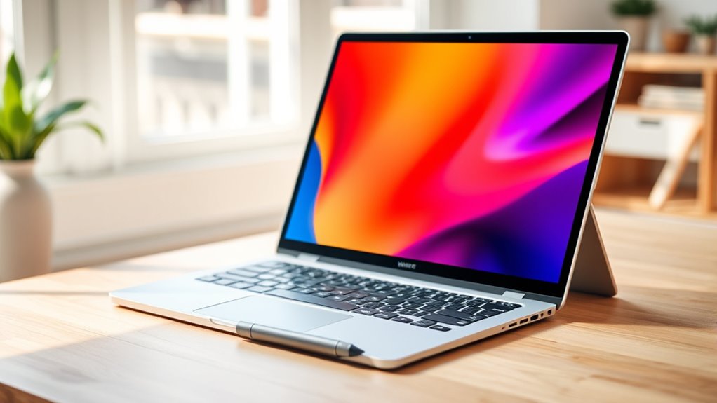 Choosing a 2-in-1 laptop that offers flexible convertible modes can notably enhance your productivity and entertainment options. The number of modes, like laptop, tent, stand, or tablet, determines how well it adapts to different tasks. A 360° hinge allows smooth alterations between modes, making switching effortless without extra accessories. Some models even feature automatic mode detection and app adjustments, streamlining your workflow. The stability of each mode, especially for activities like drawing or typing, depends on hinge design and build quality—so durability matters. Keep in mind, multiple modes can influence battery life, as switching between them may consume different amounts of power. Overall, a versatile hinge system and mode variety greatly boost a 2-in-1’s usability.