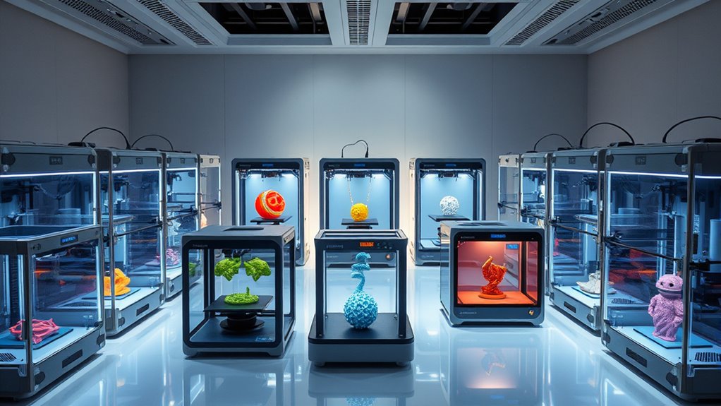 Imagine a fortress guarding your creative journey—that’s what top 3D printers offer with their safety features. Common ones include built-in enclosures to contain fumes and hot parts, automatic shut-offs when overheating, and filament sensors that pause printing if supplies run low. These features act like vigilant guardians, ensuring your workspace stays secure while you bring your ideas to life with confidence and peace of mind.