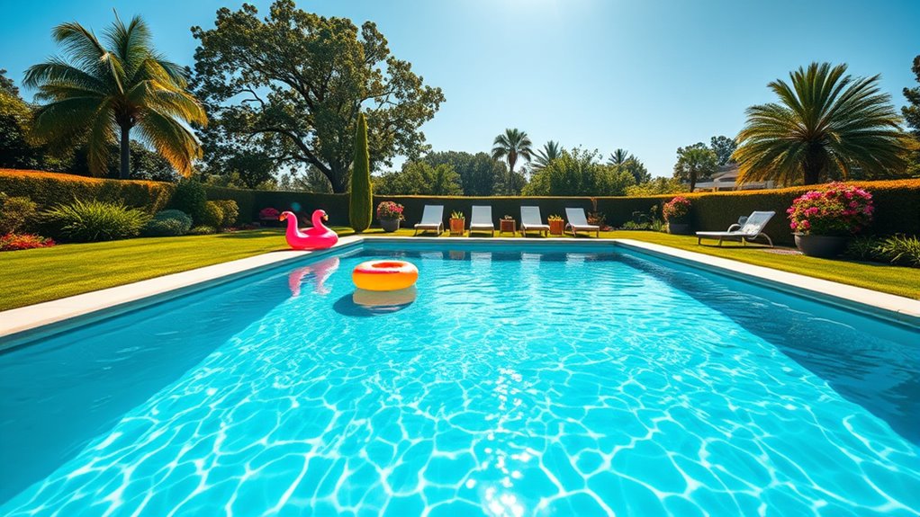 Choosing the right pool size and shape starts with understanding your outdoor space, how you plan to use the pool, and your aesthetic preferences. I recommend measuring your yard carefully and considering access points to guarantee the pool fits comfortably. Common sizes range from 8 to 24 feet in diameter, depending on your needs. Round pools provide stability and even water distribution, making them easy to install and maintain. Rectangular pools maximize space for swimming and active fun but may require a more stable foundation. Larger pools need upgraded filtration systems to keep water clean and often demand a sturdier base. Think about how you’ll use the pool — for relaxing or vigorous activities — and choose a shape that complements your yard while providing the desired capacity.