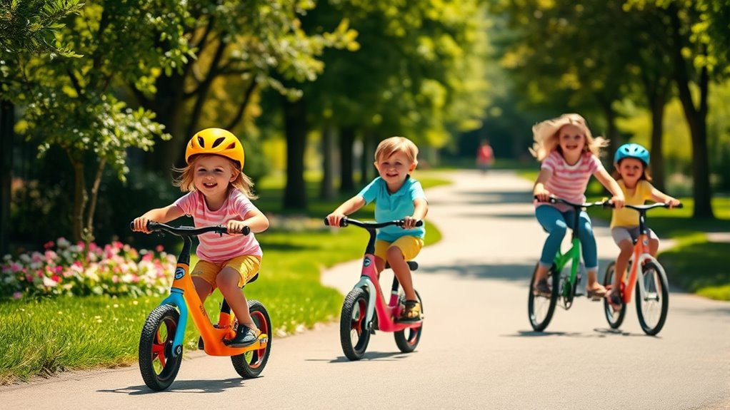 If you’re looking for the best balance bikes for kids in 2025, I’ve found some great options that build confidence and coordination. These bikes are lightweight, adjustable, and made from durable materials like alloy or carbon steel, with safety features like non-slip grips and enclosed wheels. Many models also grow with your child, supporting various age ranges from toddlers to early school age. Keep exploring further — you’ll discover factors to help you pick the perfect fit.