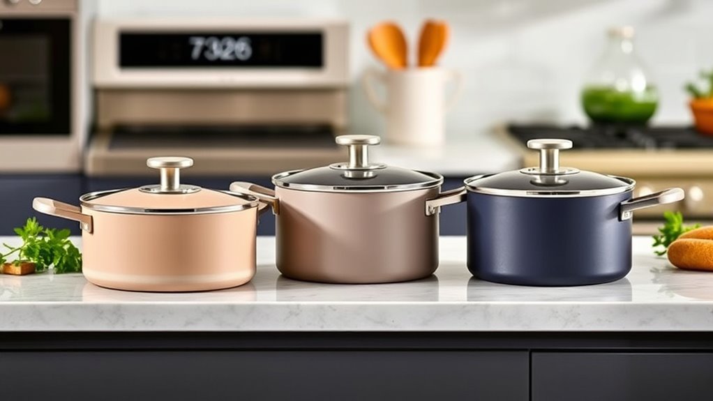 When choosing a Caraway cookware set, considering thermal conductivity is essential because it affects how quickly and evenly your pots and pans heat up. Materials like copper and aluminum have high thermal conductivity, meaning they transfer heat rapidly and help prevent hot spots, resulting in more consistent cooking. Ceramic coatings, on the other hand, tend to have lower thermal conductivity, leading to slower, more gradual heating. The base material also plays a role; layered constructions often improve heat distribution, enhancing overall performance. Better thermal conductivity means your food cooks more evenly, reducing the risk of burning or uneven results. Paying attention to this factor guarantees you select cookware that offers efficient heat transfer, giving you greater control and precision in your cooking.