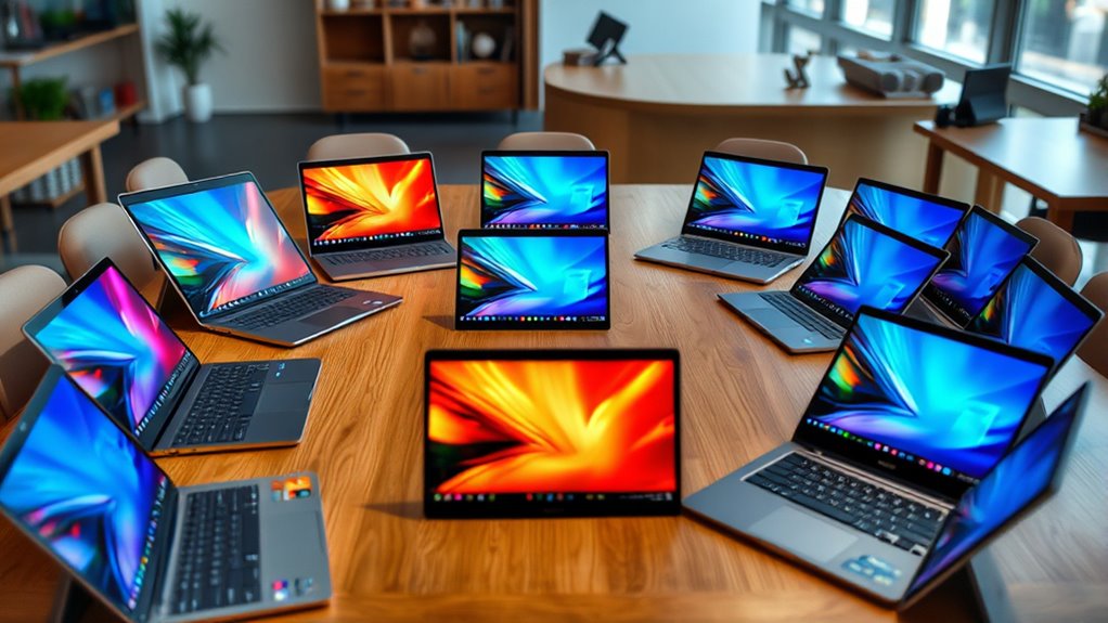Have you ever struggled to see your screen clearly in bright environments? If so, display quality is a key factor when choosing a Chromebook. It’s mainly determined by resolution, panel technology, and anti-glare features. A higher resolution, like Full HD (1920×1080), offers sharper images and more workspace, making multitasking easier. IPS panels provide wider viewing angles and more accurate colors compared to TN panels, which enhances your visual experience during collaboration or media viewing. Anti-glare or matte coatings reduce reflections and eye strain, especially in bright settings. Brightness levels, measured in nits, are vital for outdoor use; higher brightness ensures better visibility in sunlight. Prioritizing these features helps you find a Chromebook with a display that’s clear, comfortable, and suitable for various lighting conditions.