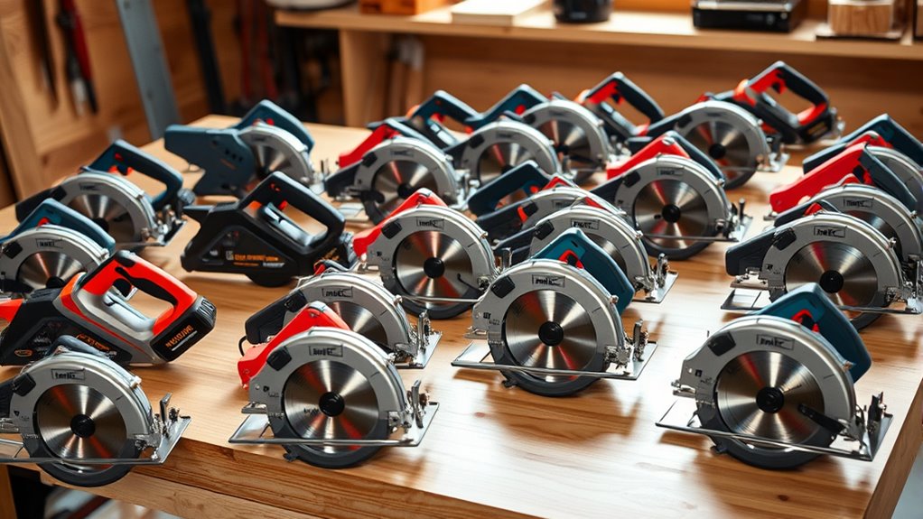 You might worry about safety with powerful tools, but modern circular saws are designed with your protection in mind. Essential features include blade guards that automatically retract, electric brakes that stop the blade quickly, and safety switches that prevent accidental starts. I always look for saws with these features because they make my work safer and give me peace of mind. Safety shouldn’t be an afterthought—it’s built into the best tools today.