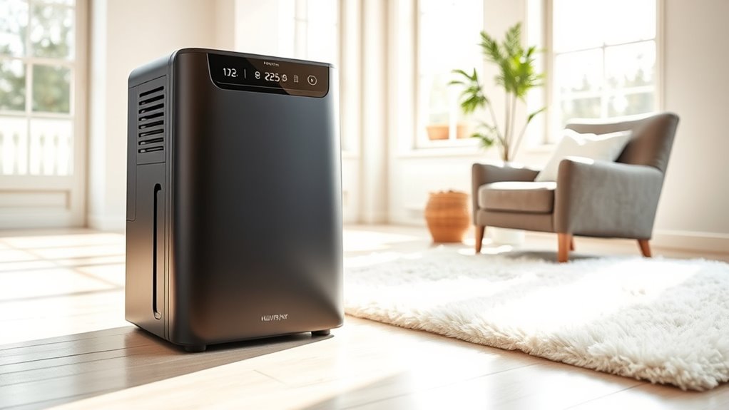 Energy efficiency standards play a essential role in ensuring your dehumidifier uses power wisely. Certifications like ENERGY STAR indicate the device meets strict criteria for lower energy consumption and reduced environmental impact. Models compliant with 2025 standards typically use 20-50% less energy than non-certified units, which can considerably lower your electricity bills. You can gauge efficiency by looking at the Pints per Kilowatt-hour (PPT/kWh) ratio—higher ratios mean better energy use. Features like automatic shut-off, programmable timers, and smart humidity controls further help optimize power consumption by preventing unnecessary operation. Choosing an energy-efficient dehumidifier not only saves you money in the long run but also minimizes your carbon footprint, supporting a more sustainable lifestyle while keeping your home comfortable.