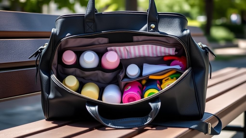 Imagine a well-balanced dance where weight, comfort, and storage move in perfect harmony. I find that diaper bags achieve this by using lightweight, durable materials that feel like a gentle hug, while strategically placed compartments keep essentials organized without bulking up the bag. Padded straps distribute weight evenly on my shoulders, making carrying effortless. It’s all about creating a bag that feels like an extension of me—easy, comfortable, and ready for anything.