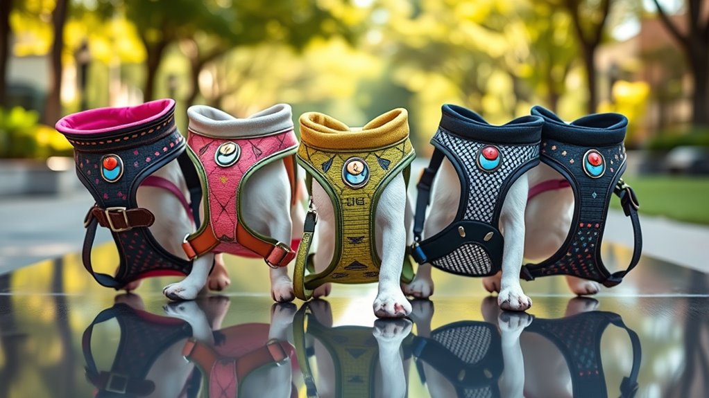 Some harnesses are like tailored suits, designed for specific breeds. For example, escape-proof harnesses work best for Houdini-like hounds, while step-in styles suit smaller or more delicate breeds. I always consider my dog’s size, activity level, and breed traits before choosing. It’s essential to match harnesses to your dog’s unique needs so they feel comfortable and secure, much like finding the perfect fit for a piece of clothing.