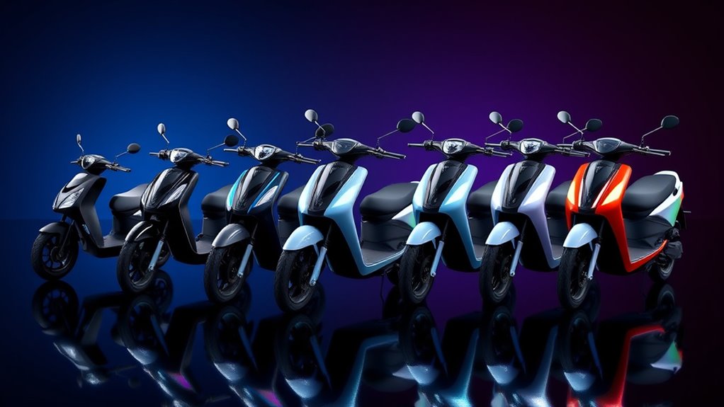 When choosing an electric scooter, I look at motor power options to match my riding needs and range capabilities to guarantee I won’t run out of juice quickly. Tire size and type are important for a smooth ride, especially on different terrains, while portability features help me carry or store the scooter easily. Safety technologies like lights and brakes also play a vital role in making every trip secure.