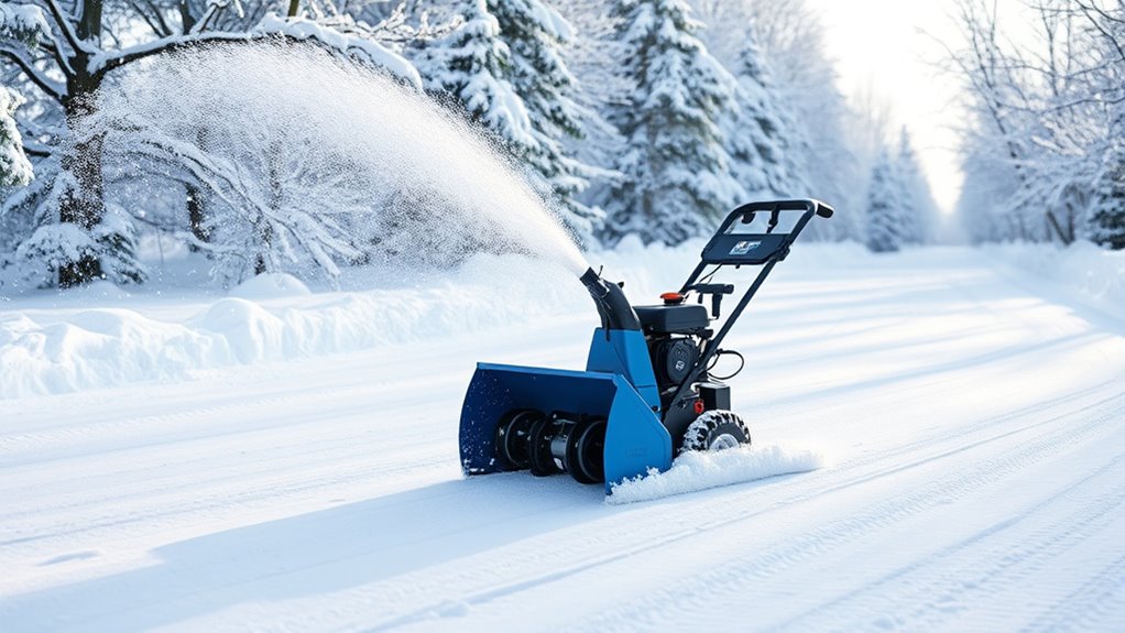 Imagine a fortress guarding its gates—that’s how safety features in electric snow blowers protect you. Common ones include automatic shut-off if the cord disconnects, safety switches that prevent accidental start-up, and debris shields to keep flying objects at bay. Some models even have textured grips and emergency stop buttons. These features give me peace of mind, letting me clear snow confidently while staying safe and secure.
