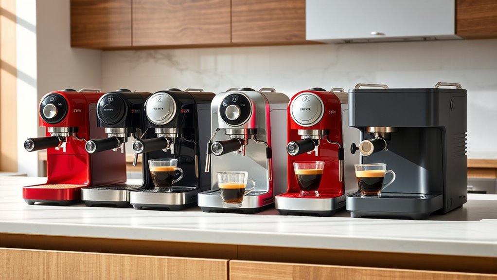 Choosing an espresso machine that’s easy to use can make all the difference for beginners. A user-friendly interface, like one-touch controls or touchscreen displays, helps reduce the learning curve. Semi-automatic machines with clear indicators and straightforward operation let you control brewing without hassle. Machines with built-in grinders and automatic milk frothers simplify the process further, making it accessible even if you’re new to espresso. Helpful accessories such as tampers and measure scoops, along with clear step-by-step instructions, boost confidence and guarantee proper use. Additionally, machines with simple maintenance routines—like easy water tank refilling and straightforward cleaning—make the experience less intimidating. Overall, choosing an easy-to-use machine encourages consistency and enjoyment as you learn to craft quality coffee at home.
