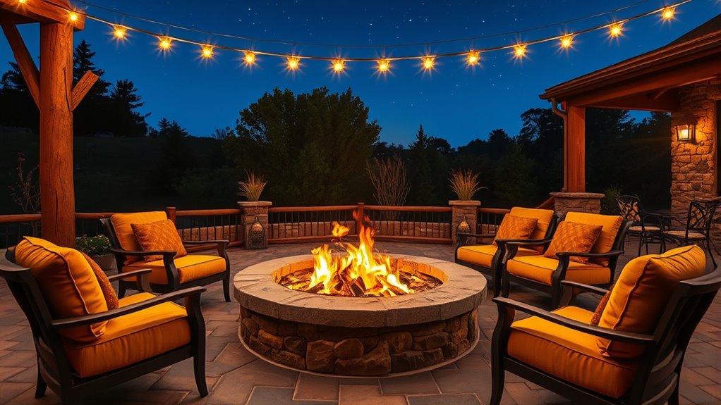 Think of smoke as a sneaky guest trying to crash your cozy night—so I make sure to position my fire pit wisely. I place it away from seating areas and guarantee the wind blows smoke away by checking the breeze before lighting up. Using a fire pit with a lid or screen helps contain smoke, and keeping the fire well-maintained prevents excessive smoke. These tricks keep my outdoor space smoke-free and inviting.