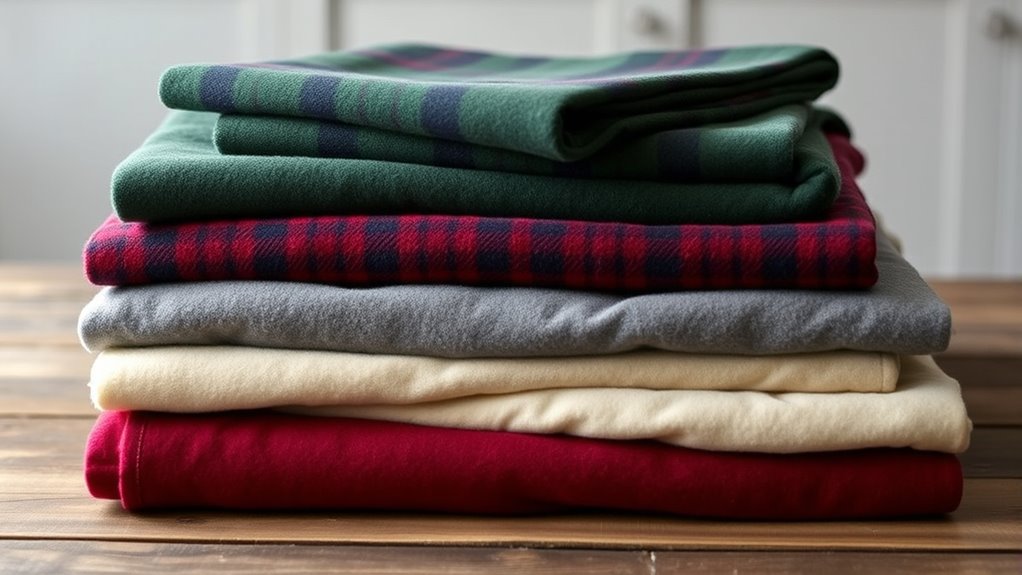 Thread count plays a essential role in determining the feel and longevity of flannel sheets, but it’s important to understand what it really measures. It counts the number of threads woven into one square inch of fabric, affecting softness and durability. Generally, higher thread counts suggest a denser weave, which can feel smoother and more luxurious. However, extremely high thread counts—above 400-600—may reduce breathability and cause stiffness if not manufactured properly. For flannel sheets, a moderate thread count around 180-200 strikes the best balance, offering softness, warmth, and breathability without sacrificing comfort. Keep in mind, thread count isn’t the only factor; fabric quality and weave type also influence how the sheets feel and perform over time.