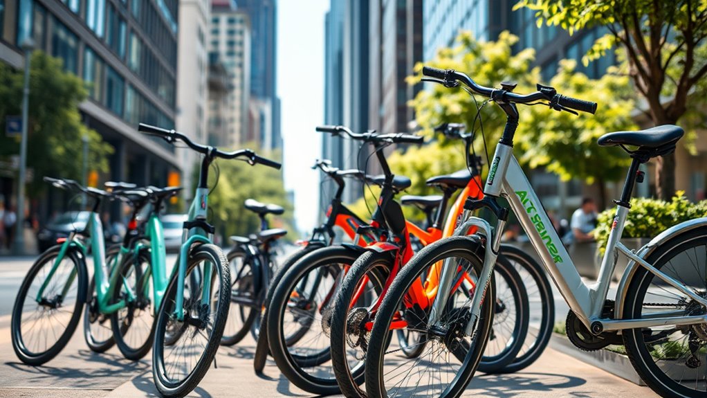 You’ll find that top folding e-bikes come with essential safety features like bright LED headlights, reflective decals, and reliable disc brakes. It’s funny how often I’ve noticed these details make a big difference, especially in low-light conditions or sudden stops. These features aren’t just extras—they’re standard because manufacturers understand how vital safety is. When you’re commuting or exploring, knowing your bike’s equipped with these gives you peace of mind.