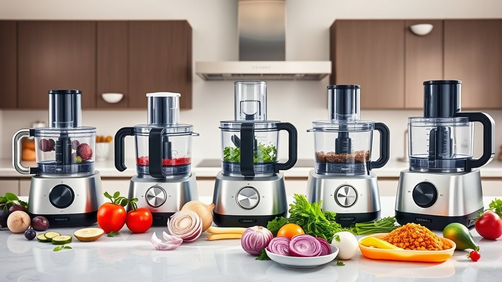 If you’re looking for the 15 best food processors of 2025, I’ve got you covered. From compact models like the BLACK+DECKER 1.5-Cup Chopper to powerful, large-capacity options like the Cuisinart 14-Cup and Ninja BN601, these units make meal prep quick and easy. They feature strong motors, versatile blades, and simple controls, reducing prep time markedly. Keep exploring to find the perfect fit for your kitchen needs and enjoy effortless cooking every day.