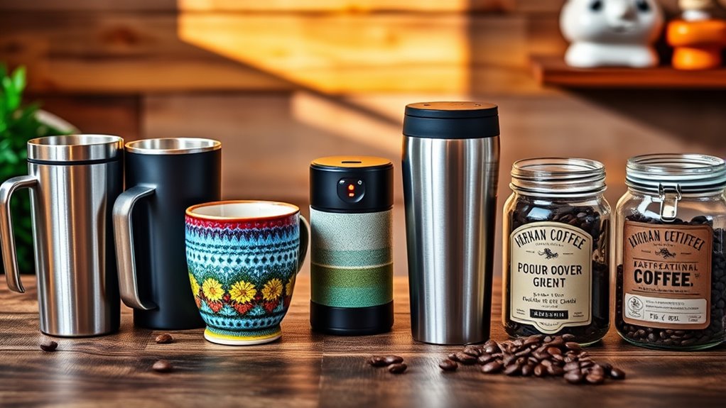 Opting for coffee gifts with unique and creative designs can truly make your present stand out and show you’ve put thought into it. Handmade crochet or handcrafted items add a personal touch that makes the gift feel special and one-of-a-kind. Incorporating fun, motivational, or humorous messages on mugs or accessories can make the gift memorable and bring a smile. Custom or themed motifs, like personalized coffee cups or unique accessories, appeal to those who love originality. Creative packaging and presentation also elevate a simple gift, transforming it into an eye-catching surprise. These thoughtful details demonstrate effort and consideration, making your gift not just functional but also a delightful piece of art that resonates with their personality and style.