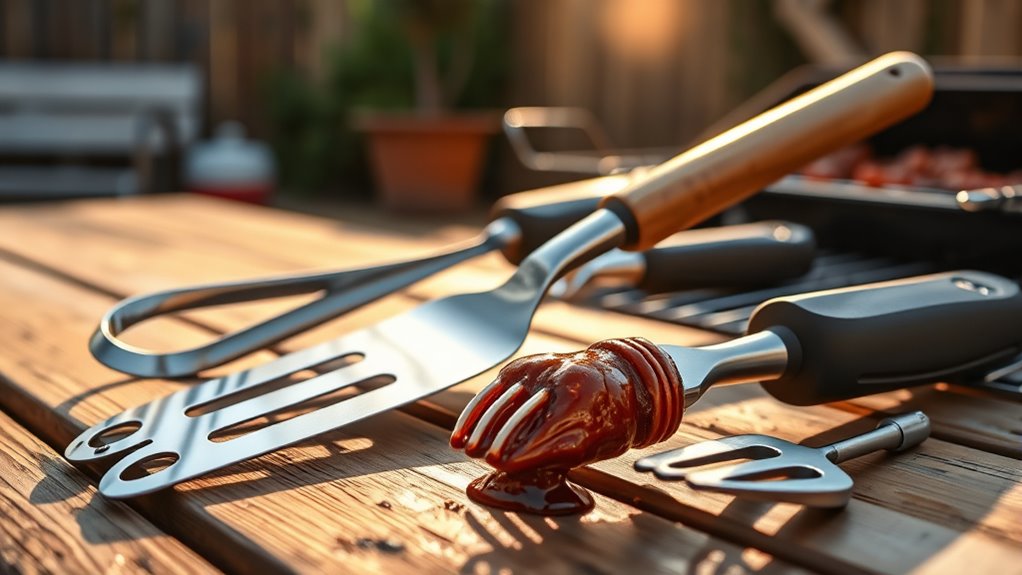 Think of your grill tools as your trusty sidekicks in a fiery adventure. I always look for heat-resistant handles that won’t melt or get too hot, and tools with secure, sturdy grips to prevent accidents. Safety locks on tongs and spatulas are a must, just like a superhero’s shield. Non-slip grips and well-balanced tools give me confidence, making my grilling safer and more enjoyable every time.