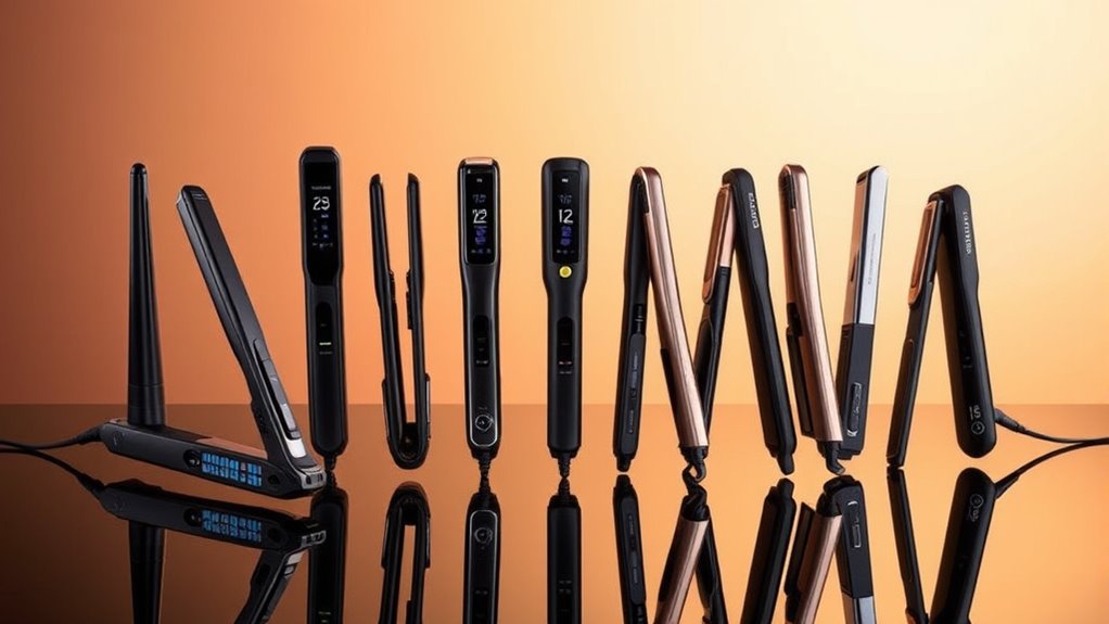 Having precise temperature control is essential because it allows you to tailor heat settings to your specific hair type, reducing the risk of damage from excessive heat. Digital or LCD displays make it easy to monitor and adjust the temperature, giving you confidence during styling. Adjustable ranges, from 250°F to 450°F, let you choose the perfect heat level for fine, thick, or chemically treated hair. Some straighteners even feature memory functions that save your preferred settings for consistent results every time. Additionally, consistent heat distribution across the plates ensures even styling and minimizes the need for multiple passes, protecting your hair from unnecessary stress. Overall, these options give you better control, safer styling, and more professional results.