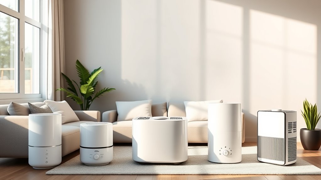 If you’re looking for the best humidifiers to boost your home’s air quality in 2025, I recommend models with large tanks, quiet operation, and smart features like app control and automatic humidity adjustment. Top options include ultrasonic designs with top-fill setups, aromatherapy functions, and multiple nozzles for even coverage. Whether you want a compact unit or a larger one for bigger rooms, there’s something for everyone. Keep going, and I’ll guide you through the top choices.