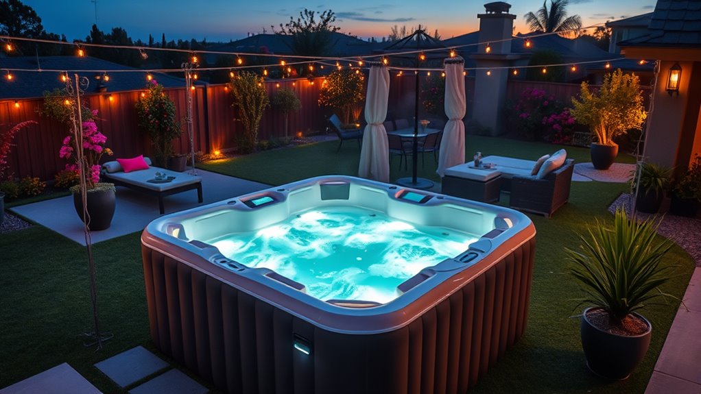 Keeping your inflatable hot tub hygienic is like tending a lush garden—you need consistent care. I regularly check and balance the water’s pH and sanitizer levels, clean filters, and drain and refill the tub as recommended. A quick wipe-down of the surfaces helps prevent buildup. With these simple steps, I ensure every soak is fresh, safe, and inviting, turning my hot tub into a personal oasis.
