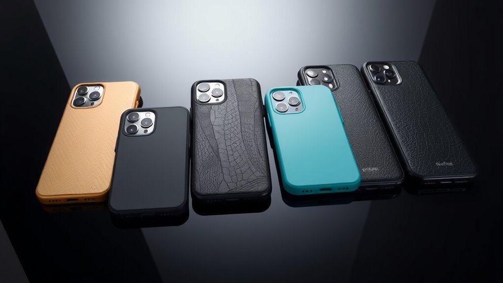 Choosing an iPhone 17 Pro Max case that can withstand drops is vital, especially if you want to protect your device from everyday accidents. Look for cases that have passed military-grade drop tests, with ratings of 10FT or 16FT drop protection, to guarantee durability. Multi-layer shockproof designs, like those with air cushioning or reinforced corners, effectively absorb impact forces. Raised bezels or bumpers around the screen and camera are essential for preventing direct damage during falls. Also, check the material quality—thermoplastic polyurethane (TPU) and polycarbonate are known for their shock-absorbing properties. Finally, opt for cases that have been rigorously drop-tested over 30,000 impacts, confirming consistent impact resistance and reliable protection for your device.