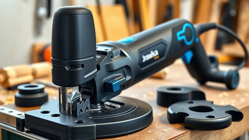 Ergonomic design features considerably influence how comfortably and accurately you can work with a jigsaw. A well-designed handle with rubberized grips or contours reduces hand fatigue during prolonged use, keeping you comfortable. Proper weight distribution and overall balance are essential for minimizing strain and maintaining control, especially when making precise cuts. Adjustable speed triggers and controls let you customize operation to fit your comfort level and the task at hand, increasing efficiency. Features like low-vibration design and soft-start mechanisms improve handling and lessen user fatigue, making your work smoother. Additionally, a compact, lightweight build enhances maneuverability, allowing easier access to tight spaces and complex angles. Prioritizing these ergonomic features helps you work longer, more accurately, and with less discomfort.