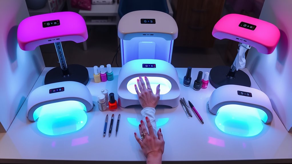 Selecting an LED nail lamp with the right timer and sensor features can make your manicure routine more efficient and comfortable. Multiple timer options, like 30, 60, or 90 seconds, allow me to customize curing based on gel type and thickness. Some lamps even offer customizable settings, saving time for frequent users. Automatic sensors are a game-changer—they turn the lamp on when I insert my hand or foot and off when I remove it, eliminating the need for manual control. A clear timer display helps me monitor curing progress and select the right duration easily. Advanced models include memory functions that recall previous settings, speeding up the process. Low heat modes and precise sensor activation ensure a comfortable, painless experience while preventing skin sensitivity or overheating.