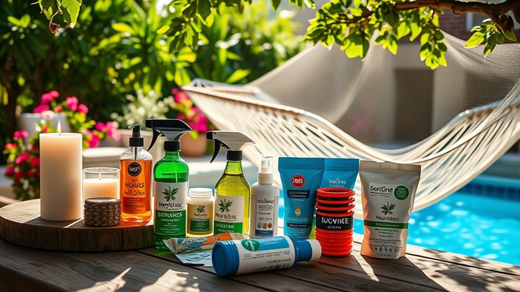 If you want to stay bug-free all summer, I recommend trying a mix of natural and chemical options. I use mosquito bracelets with citronella, Eco-friendly sprays with lemon eucalyptus, or device-based repellents that create a protected zone. For extended outings, I rely on DEET-based sprays like OFF! or Sawyer lotion. Curious about more safe, effective solutions? Keep exploring to find the best match for your outdoor adventures.
