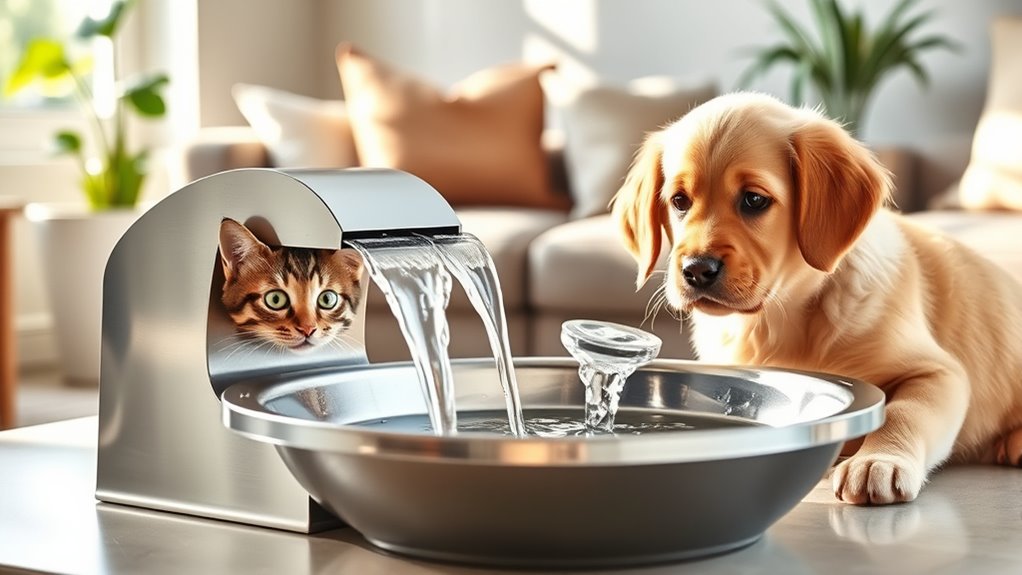 Have you ever noticed how some pets prefer moving water over still? Many cats are naturally attracted to flowing streams, which can encourage them to drink more and stay better hydrated. Small dogs might favor larger, shallow bowls or fountains that mimic natural water sources, making drinking easier. The noise level of the fountain’s pump also matters; quieter models tend to be more appealing, as loud splashing can discourage pets from drinking. Additionally, pets with sensitivities or health issues often prefer hygienic options like stainless steel or ceramic fountains, which reduce bacteria buildup compared to plastic. Understanding your pet’s preferences helps you choose a fountain they’re comfortable with, encouraging consistent hydration and keeping them happy and healthy.