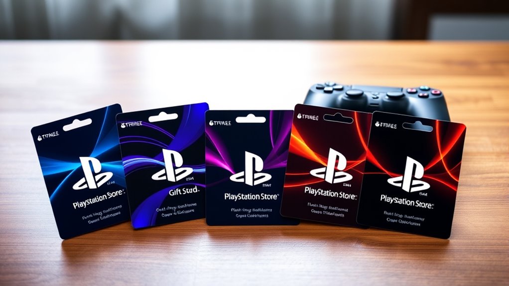 Considering the various digital gift card options available, choosing the right PlayStation Store gift card depends on factors like flexibility, delivery speed, and compatibility. Digital cards are delivered electronically via code, making physical packaging unnecessary and enabling instant delivery through email or messaging platforms. They come in different denominations, such as $25, $50, or $250, offering flexibility for various budgets. Many digital cards are compatible across multiple PlayStation consoles, including PS3, PS4, PS5, and PS Vita, ensuring broad usability. This versatility allows you to pick a card that suits the recipient’s preferences and devices. Additionally, digital options eliminate shipping delays, making them perfect for last-minute gifting. Overall, understanding the card type helps ensure the gift is convenient, adaptable, and ready for instant redemption.