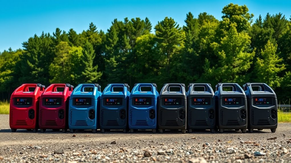 Selecting the right fuel type for your portable generator can considerably impact its convenience, efficiency, and environmental footprint. Gasoline is common, offering quick refueling but shorter shelf life and more emissions. Propane and natural gas burn cleaner, cause less engine wear, and are better for the environment, though they may need special adapters. Some generators are dual or triple fuel, switching between sources for flexibility and continuous power. Runtime depends on tank size and load; larger tanks and lighter loads extend operation. Fuel efficiency also plays a role in planning for outages or remote use. Choosing a generator with the right fuel options ensures you’re prepared, whether for emergency power, outdoor adventures, or job sites, and helps optimize performance and convenience.