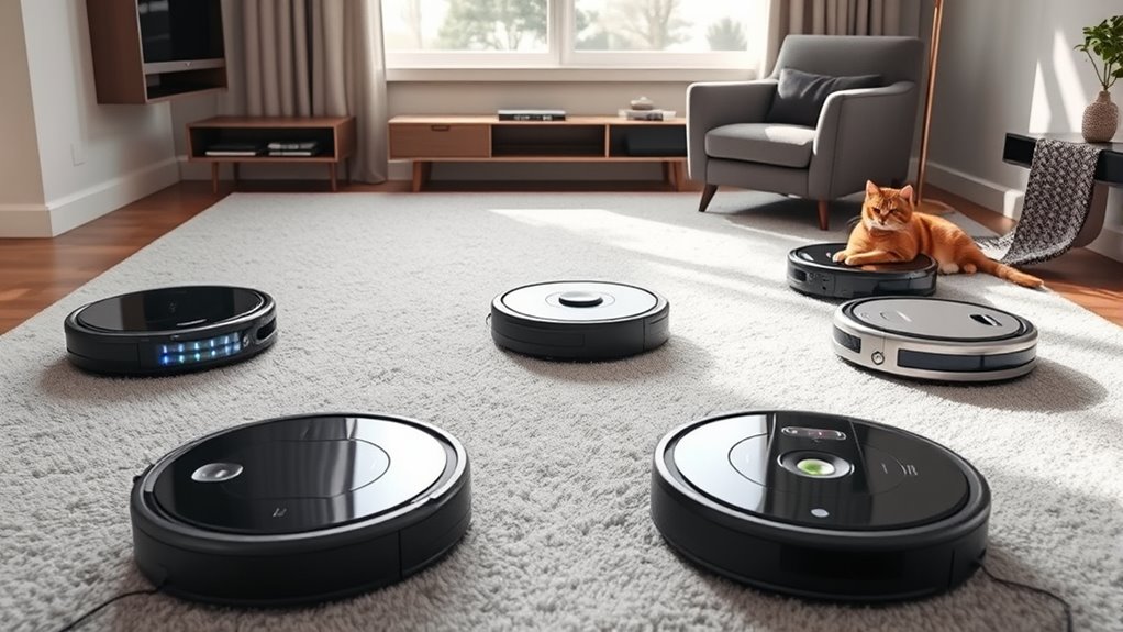 App and voice control features have become game-changers when it comes to managing robot vacuums for pet hair. With app control, I can schedule cleaning sessions, customize zones, and monitor the vacuum’s progress from anywhere, making pet hair removal much more efficient. Voice command integration with Alexa, Siri, and Google Assistant allows me to start, stop, or redirect cleaning without lifting a finger, which is especially handy during busy moments. Many apps provide detailed cleaning reports and maintenance alerts, helping me keep the vacuum operating at its best around areas with pet dander and hair. Additionally, multi-floor mapping lets me target high-traffic pet zones precisely. Overall, these features make managing my robot vacuum more convenient, flexible, and responsive to my pet hair cleaning needs.