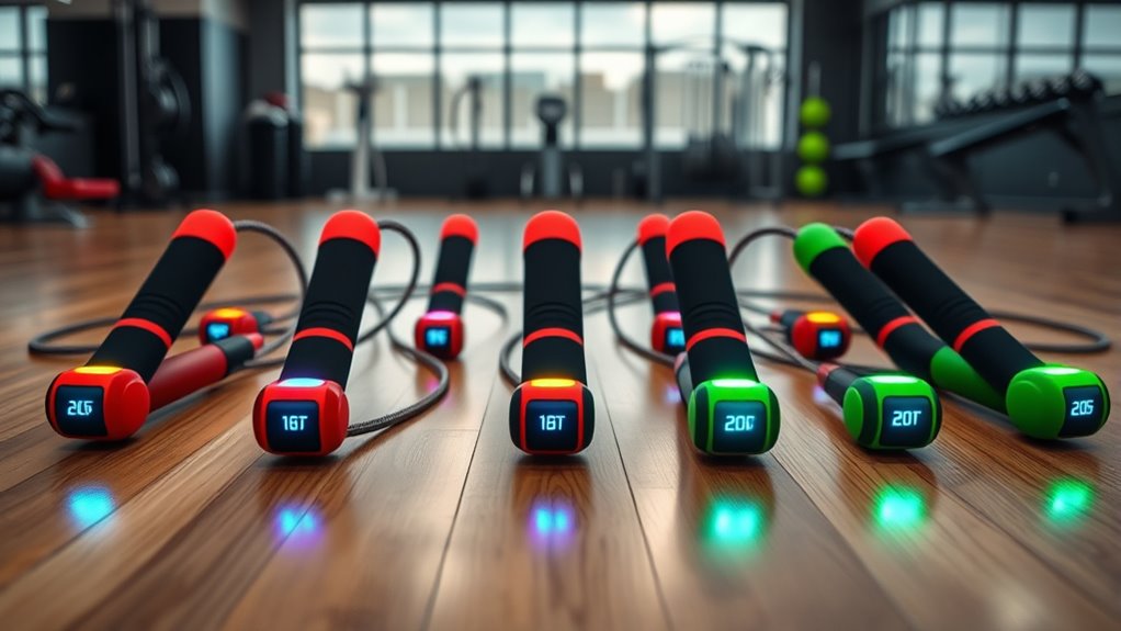If you’re looking to boost your workout game in 2025, I recommend checking out the top smart jump ropes that combine durability, accurate tracking, and versatile features. From app-connected models to cordless options with LED displays, these ropes are designed for all fitness levels and spaces. Each offers adjustable length, rechargeable batteries, and smooth rotation for a seamless experience. Stay with me to discover the best options and what makes them stand out.