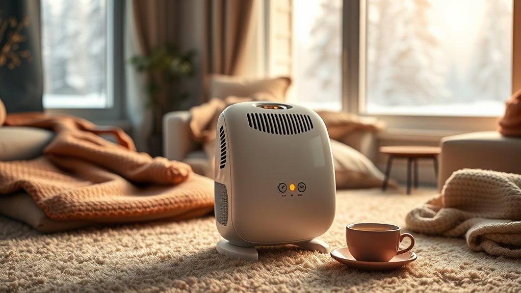 If you’re looking to keep your home cozy this winter, I recommend checking out the top-rated space heaters like the Amazon Basics Ceramic, Lasko oscillating tower, EdenPURE GEN70, and Dreo models. They’re compact, efficient, and come with useful safety features, adjustable settings, and various styles to suit your space. Choosing the right one depends on your room size and needs, so there’s plenty of options. Keep going to discover more tips and options that fit your home perfectly.