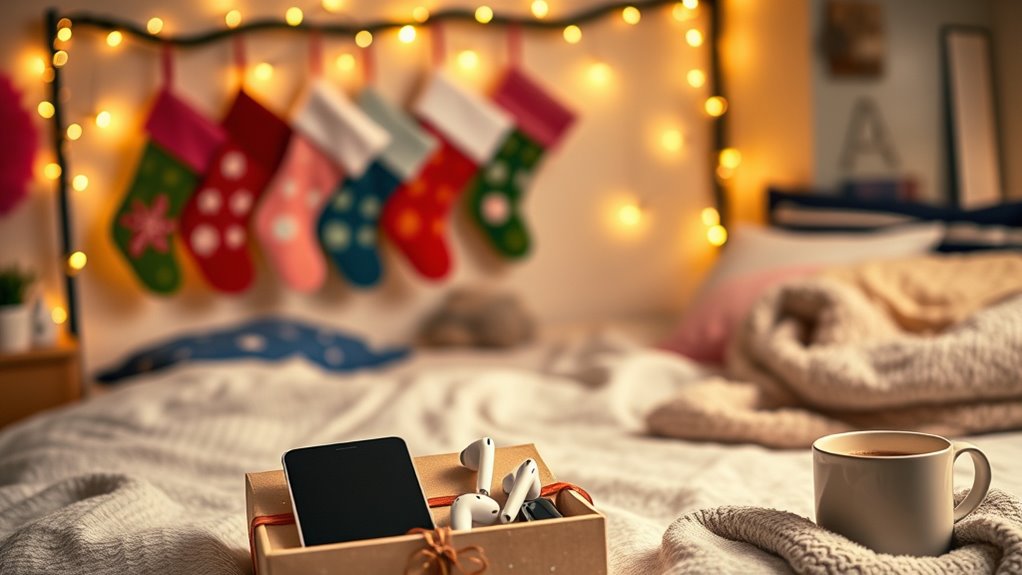 Just like Santa’s sleigh needs the right reindeer to deliver joy, choosing thoughtful stocking stuffers guarantees your college student feels loved and supported. Whether it’s practical tools or fun games, these gifts show you care, making their holiday season truly special. Remember, it’s the small, meaningful touches—like a guiding star—that brighten their path and remind them they’re always in your thoughts. After all, love is the best gift of all.