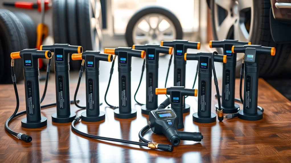 Choosing a tire inflator that’s easy to operate makes the task quick and hassle-free. Look for models with digital displays and preset pressure modes, so you can set your desired PSI and monitor inflation easily. Auto shut-off features are a game-changer, stopping the pump once your target pressure is reached, preventing over-inflation. Controls should be intuitive, with clearly labeled buttons for starting, stopping, and adjusting pressure. For better visibility in low-light conditions, opt for inflators with built-in LED lights or backlit screens. Portability matters too—a compact, lightweight design with accessories like quick-connect fittings or a storage case makes handling and transportation effortless. These features combine to make inflating tires simple, safe, and efficient, even for beginners.
