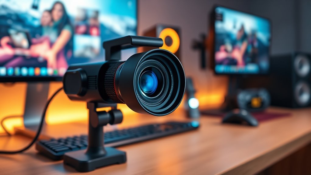 Ever wonder how to guarantee your voice comes through loud and clear during your streams? Microphone clarity is essential for professional-quality streaming. Features like noise-canceling tech and dual microphones can cut out background sounds and reduce distortion, ensuring your voice stays crisp. Placement matters—keeping the microphone close to your mouth enhances natural sound and intelligibility. High-end webcams often include automatic noise reduction and echo cancellation, which help create a clean, distraction-free audio experience in various environments. Additionally, the microphone’s frequency response and sensitivity play critical roles in capturing vocal nuances accurately. Choosing a webcam with these audio features ensures your audience hears you clearly, making your streams more engaging and professional. Your voice should be as sharp and clear as your video.