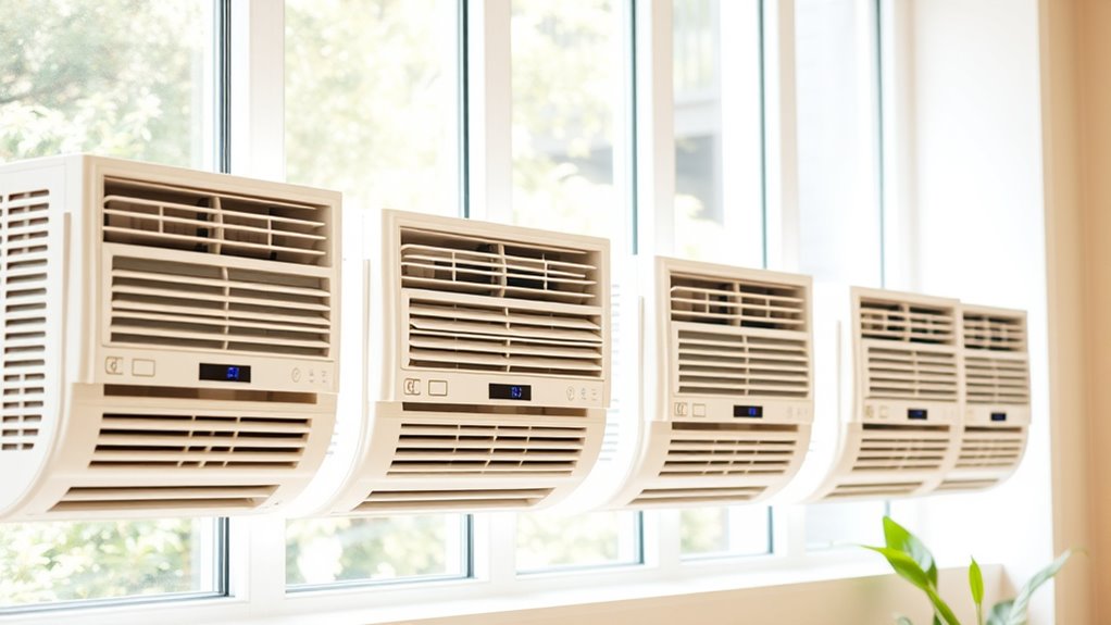 Smart technology features are transforming the way we control and monitor window air conditioners, making it easier to stay comfortable and save energy. With Wi-Fi connectivity, I can adjust settings, change temperatures, and turn units on or off remotely via smartphone apps. Voice control integration with Alexa or Google Assistant adds convenience, allowing hands-free operation. Many models provide real-time data on wattage, temperature, and operational status, helping me monitor energy use and troubleshoot issues quickly. Features like scheduling and auto-restart enhance convenience and efficiency, ensuring the unit operates only when needed. Compatibility with smart home ecosystems means I can integrate my air conditioner with other devices for seamless automation, giving me greater control and helping reduce energy costs while maintaining comfort.