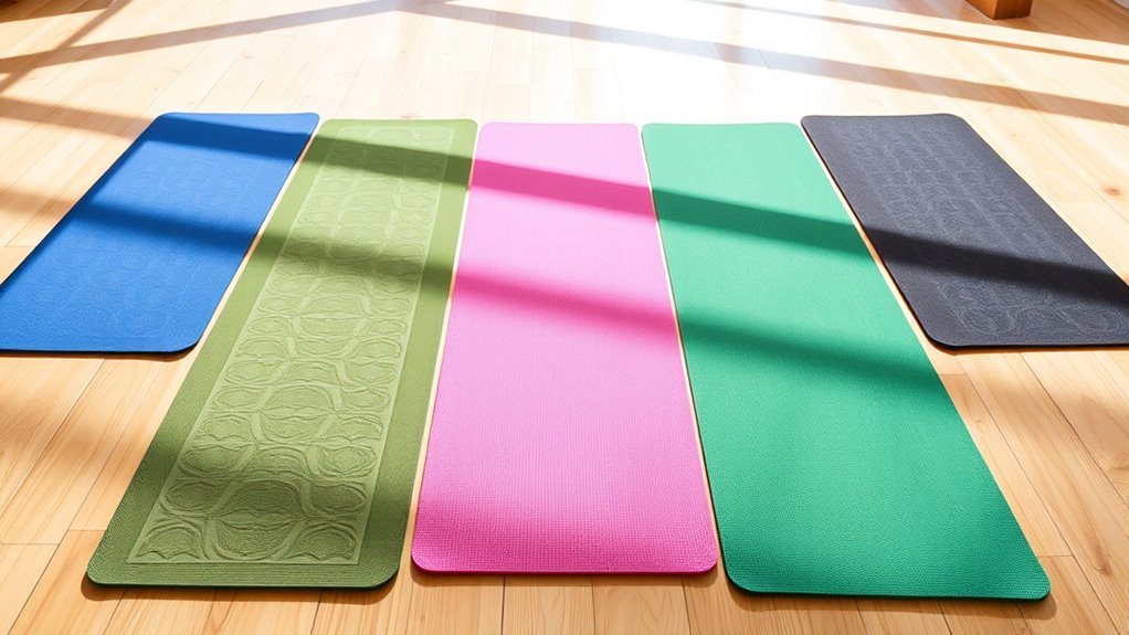 Choosing a non-slip yoga mat starts with understanding the surface material, as it directly affects your grip and safety during practice. Common options include textured rubber, TPE, and PVC, each designed to increase traction. The surface should deliver consistent grip even when you’re sweaty or wet, reducing the risk of slipping and injuries. Some mats feature specialized patterns or textures that boost friction between your hands, feet, and the mat. If you prefer eco-friendly choices, there are latex-free options that provide excellent grip without harmful chemicals. Durability matters too; a good surface material maintains its non-slip qualities over time, even with frequent use. Picking the right surface material guarantees your practice remains stable, safe, and comfortable.