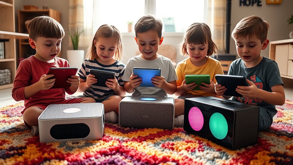 Audio quality and volume are essential factors to contemplate because they directly affect how enjoyable and clear the content sounds during playback. I’ve noticed that some devices deliver richer sound with deeper bass, creating a more immersive experience. The volume range also varies; it’s important to guarantee the device can reach loud enough levels for noisy environments or gentle enough for quiet settings. Precise volume control, either through physical buttons or apps, makes it easier to set the perfect listening level for kids and parents alike. Sound clarity is key for storytelling and music, so devices that minimize background noise and enhance speech are preferable. Additionally, supporting safe listening levels helps protect children’s hearing while still providing a satisfying audio experience.