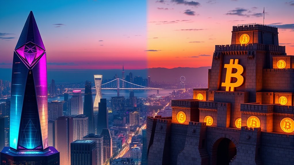 Market performance and price volatility reveal how each cryptocurrency responds to evolving technological and macroeconomic factors. You’ll notice Bitcoin tends to be more stable, rising about 16% from April 2024 to March 2025, as its reputation as a “digital gold” grows. Meanwhile, Ethereum’s price drops roughly 50% during the same period but then rebounds 50% in just a week, reflecting its sensitivity to developer activity and DeFi trends. Bitcoin’s stability appeals to macro investors seeking a hedge, while Ethereum’s fluctuations are driven by innovation, regulatory shifts, and network upgrades. Both assets experience volatility, but Bitcoin’s trend is toward lower swings over time, reinforcing its role as a store of value. Ethereum’s dynamic nature keeps it more exposed to market swings tied to technological developments. Additionally, Ethereum’s highly versatile platform facilitates a broad range of applications beyond simple transactions, influencing its price movements and market perception.
